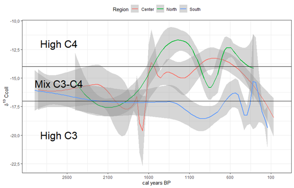 Gil et al. (2011) rejected the idea that maize was significant in the human diet as early as 2000 years ago in a study that sampled archaeological remains from northwest Mendoza where there was historic evidence of farming and contact with the Inka. These authors concluded that maize was incorporated early but only became significant in the human diet after ca. 1,000 years BP (Gil et al. 2011; Figure 4). Subsequent investigations explored the earliest maize isotopic signal and its geographic distribution improving sample size, explored greater temporal depth, and expanded geographic scale within CWA (Gil et al. 2011, 2014). ẟ13C data indicates that C4 resources initially (ca. 2000 years BP) were not very significant in the CWA human diet, and when they were, it was highly variable among contemporaneous individuals. However, this research shows that after 1,000 years BP, C4 resources became a significant energy source in the northern CWA (Freeman et al. 2024; Gil et al. 2009; Peralta et al. 2022, 2024; Figure 4). The ẟ13C and ẟ15N values show a population with a highly heterogeneous diet. This spatial and temporal expansion in the database of stable isotopes on human bone allows us to visualize an extensive range of variation that cannot be simply assumed as a directional increase of C4 thought time (Figure 4).